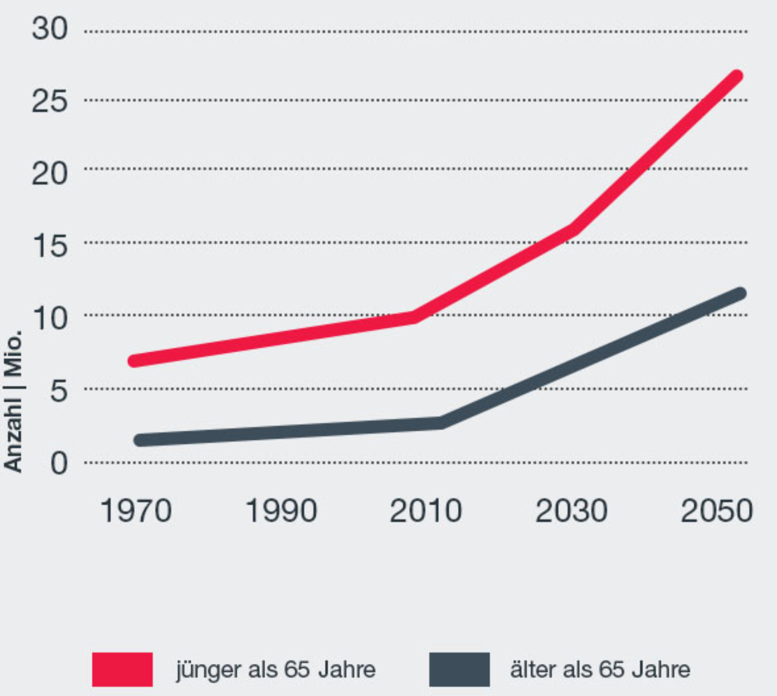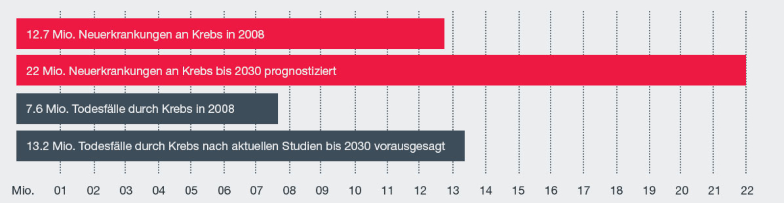 Weltweite Zunahme der jährlichen Neuerkrankungen an Krebs in Millionen h2 >